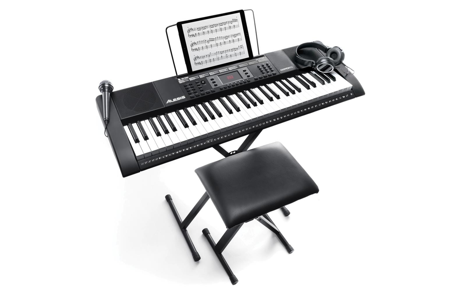 W komplecie dostaniesz: łatwy w montażu statyw klawiszowy, ławę z regulacją wysokości, słuchawki, które po wpięciu wyciszają głośniki (świetne do ćwiczeń!), pulpit na nuty, zasilacz, a nawet mikrofon do śpiewania podczas gry!