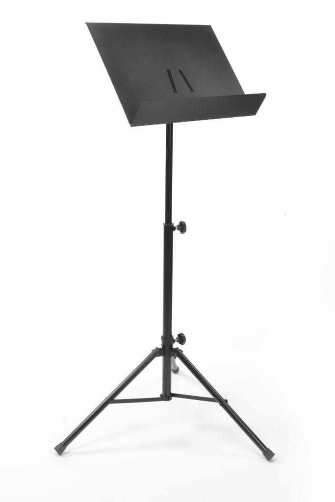Wysokiej jakości, profesjonalny statyw do nut na metalowym trójnogu z płynną regulacją wysokości i składanym stalowym pulpitem