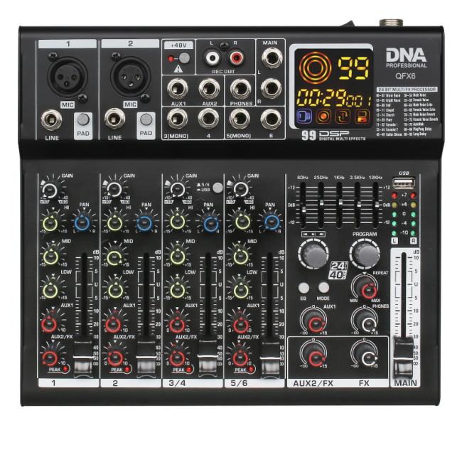 DNA QFX6 to profesjonalny, analogowy mikser dźwięku Bluetooth, wyposażony w sześć kanałów wejściowych mono, wyjście słuchawkowe (jack 6,35 mm), dwa wyjścia AUX, dwa wyjścia REC OUT (cinch/RCA), kontrolę panoramy sygnału kanału, zasilanie Phantom +48V, złącze USB-B do połączenia z komputerem, procesor DSP oraz intuicyjny odtwarzacz MP3. Sprzęt doskonale sprawdza się jako mikser sceniczny podczas niewielkich występów estradowych i koncertów, na salach prób, a także w domowym studio nagrań.