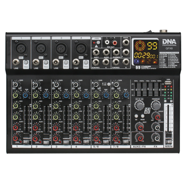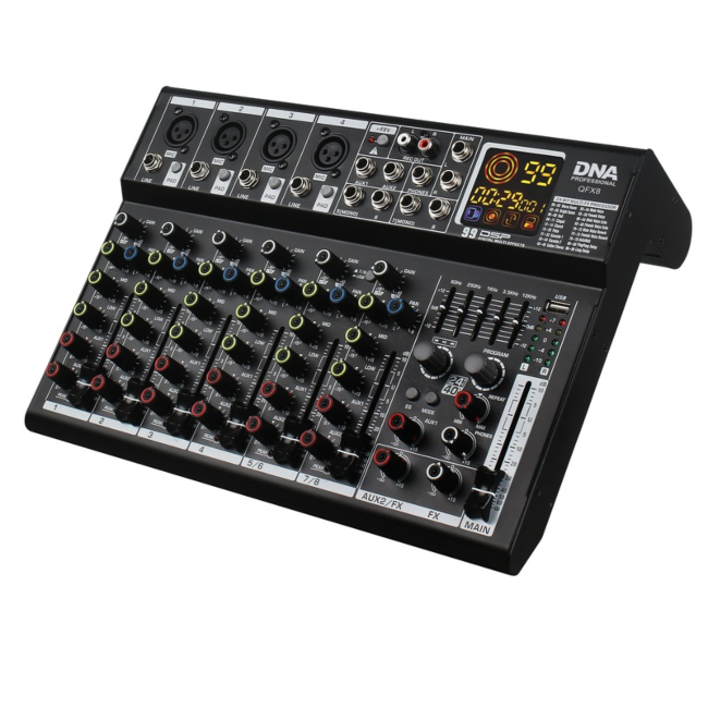 DNA QFX8 to profesjonalny, analogowy mikser dźwięku Bluetooth, wyposażony w osiem kanałów wejściowych mono, wyjście słuchawkowe (jack 6,35 mm), dwa wyjścia AUX, dwa wyjścia REC OUT (cinch/RCA), kontrolę panoramy sygnału kanału, zasilanie Phantom +48V, złącze USB-B do połączenia z komputerem, procesor DSP oraz intuicyjny odtwarzacz MP3. Sprzęt doskonale sprawdza się jako mikser sceniczny podczas niewielkich występów estradowych i koncertów, na salach prób, a także w domowym studio nagrań.