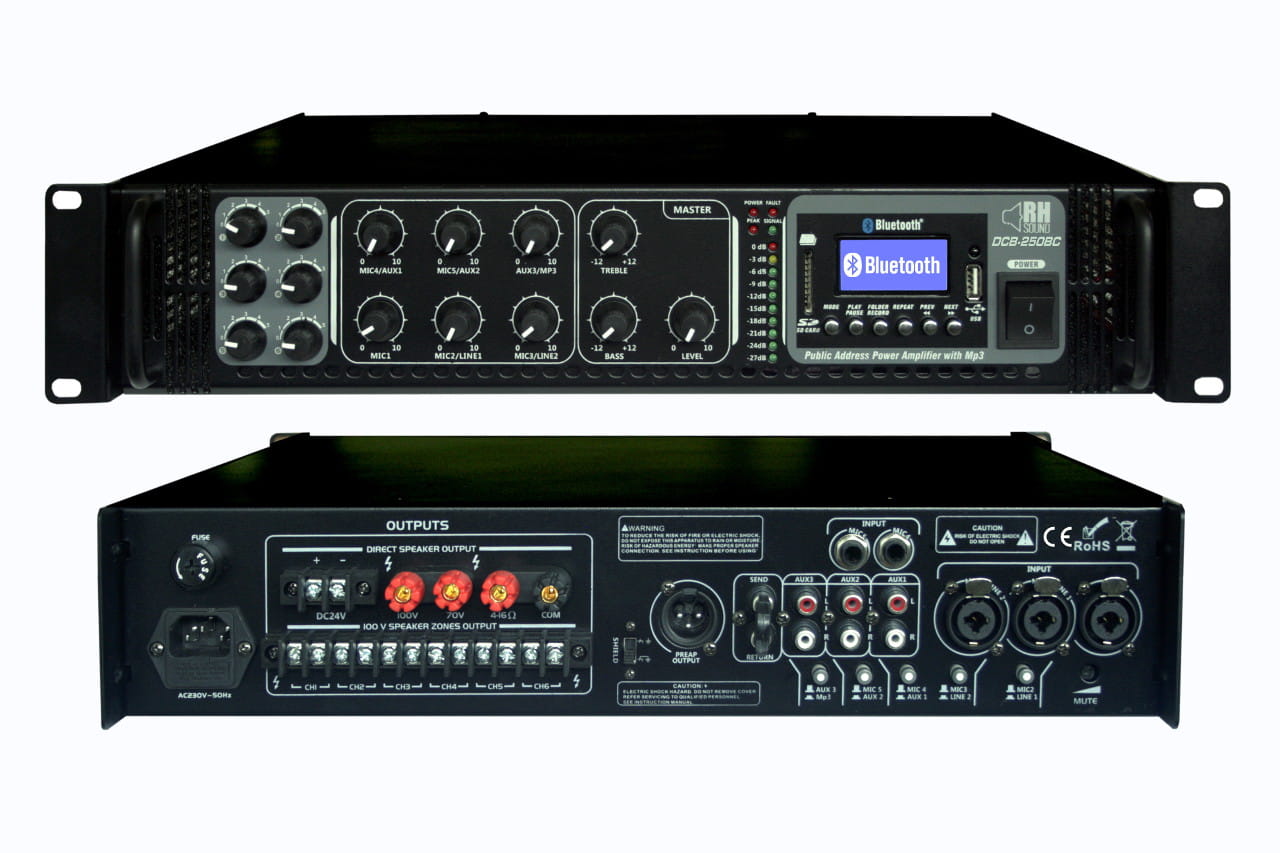 Wzmacniacz radiowęzłowy uniwersalny znajdujący swoje zastosowanie jako zasilanie systemów nagłośnienia we wszystkich obiektach użyteczności publicznej, hotelach, restauracjach, urzędach, handlowych oraz sakralnych. Nowoczesna jednostka nagłośnieniowa z odtwarzaczem MP3. Duża moc wyjściowa oraz wyjście z podziałem na 6 niezależnych stref głośników pozwala na zasilanie systemów nagłaśniających duże powierzchnie. Wejścia: 3 x MIC (MIC z funkcją priorytetu), 3 x AUX, wbudowany odtwarzacz MP3 - dane z zewnętrznej pamięci USB lub karty SD. Łącze Bluetooth do urządzeń wyposażonych w profil A2DP np. telefon komórkowy. Wskaźnik poziomu sygnału wyjściowego MASTER VOLUME LED, wspólna korekcja tonów niskich i wysokich. Całość z możliwością zdalnego sterowania. Wzmacniacz posiada możliwość serwisowego włączenia zasilania PHANTOM na wszystkich kanałach mikrofonowych jednocześnie, co pozwala na użytkowanie mikrofonów pojemnościowych bez dodatkowego osprzętu (użytkowanie mikrofonów dynamicznych tylko przy połączeniu niesymetrycznym - przewodem dwużyłowym).