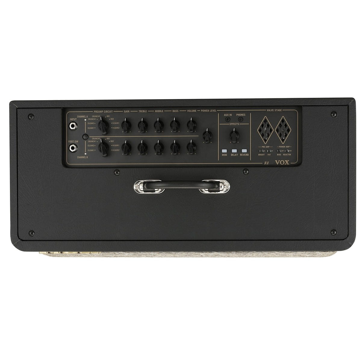 różnych układów analogowych przedwzmacniaczy, które tworzą osiem rodzajów brzmień lampowych od przejrzyście „czystych”, przez lekko przesterowane typu „CRUNCH” oraz mocno przesterowane typu „HI-GAIN”. Na szczególną uwagę zasługuje, wprowadzenie nowatorskiej sekcji wzmacniacza „VALVE STAGE”, która to odpowiedzialna jest, za kształtowanie ogólnego charakteru brzmienia wzmacniacza, poprzez dodawanie charakterystycznych składowych harmonicznych w zakresie niskich oraz wysokich tonów. Często w różnego rodzaju opisach wzmacniaczy, można napotkać na sformułowania określające charakter brzmienia jako np. „brytyjski” lub „amerykański”, sekcja „VALVE STAGE” odpowiada właśnie, za zmiany ogólnego charakteru brzmienia. Dopełnieniem bogatego zestawu funkcji są trzy efekty wysokiej jakości, w tym Chorus, Delay i Reverb. Seria AV to chyba najbardziej rewolucyjne konstrukcje lampowe w całej długiej historii marki Vox.